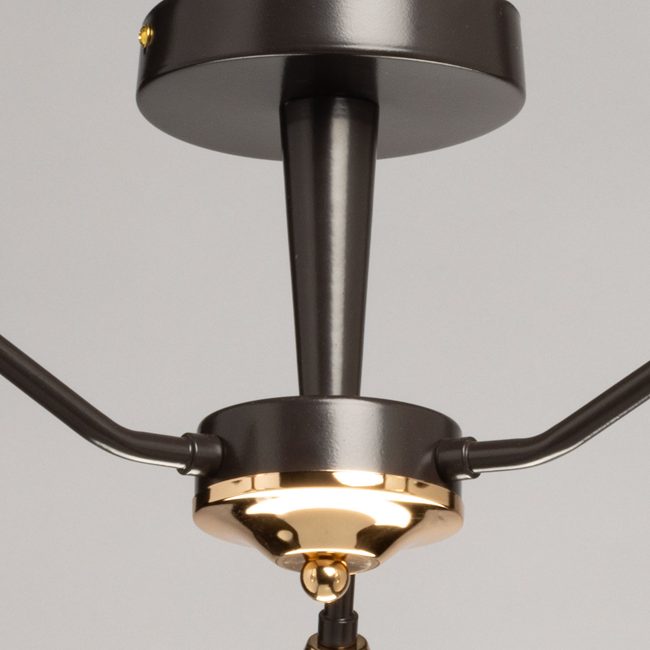 Основание светильника выполнено из металла и окрашено в цвет кофе. Отдельные элементы основания гальванизированы в цвет золота. Стеклянные плафоны отлиты в сложную форму с внутренней текстурой и гальванизированы в дымчатый цвет.