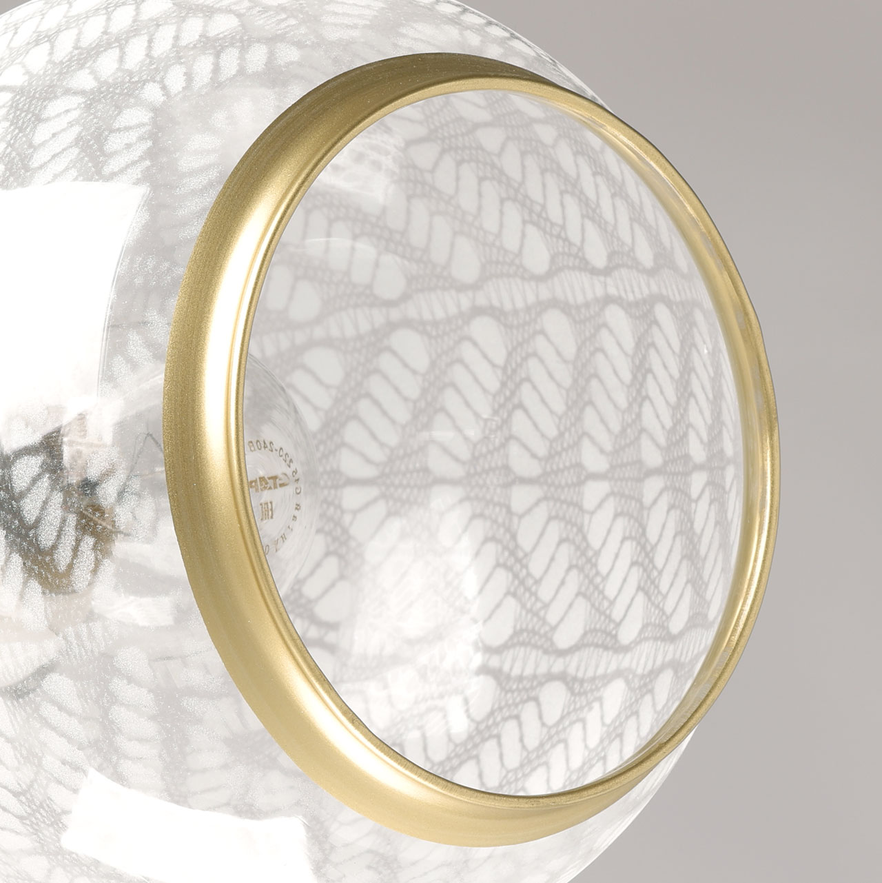 Металлическое основание подвесной люстры гальванизировано в цвет латуни. Отдельные элементы основания окрашены в черный цвет. Плафоны отлиты вручную и матированы по трафарету в растительный мотив. Края плафонов отделаны кантом цвета латуни.
