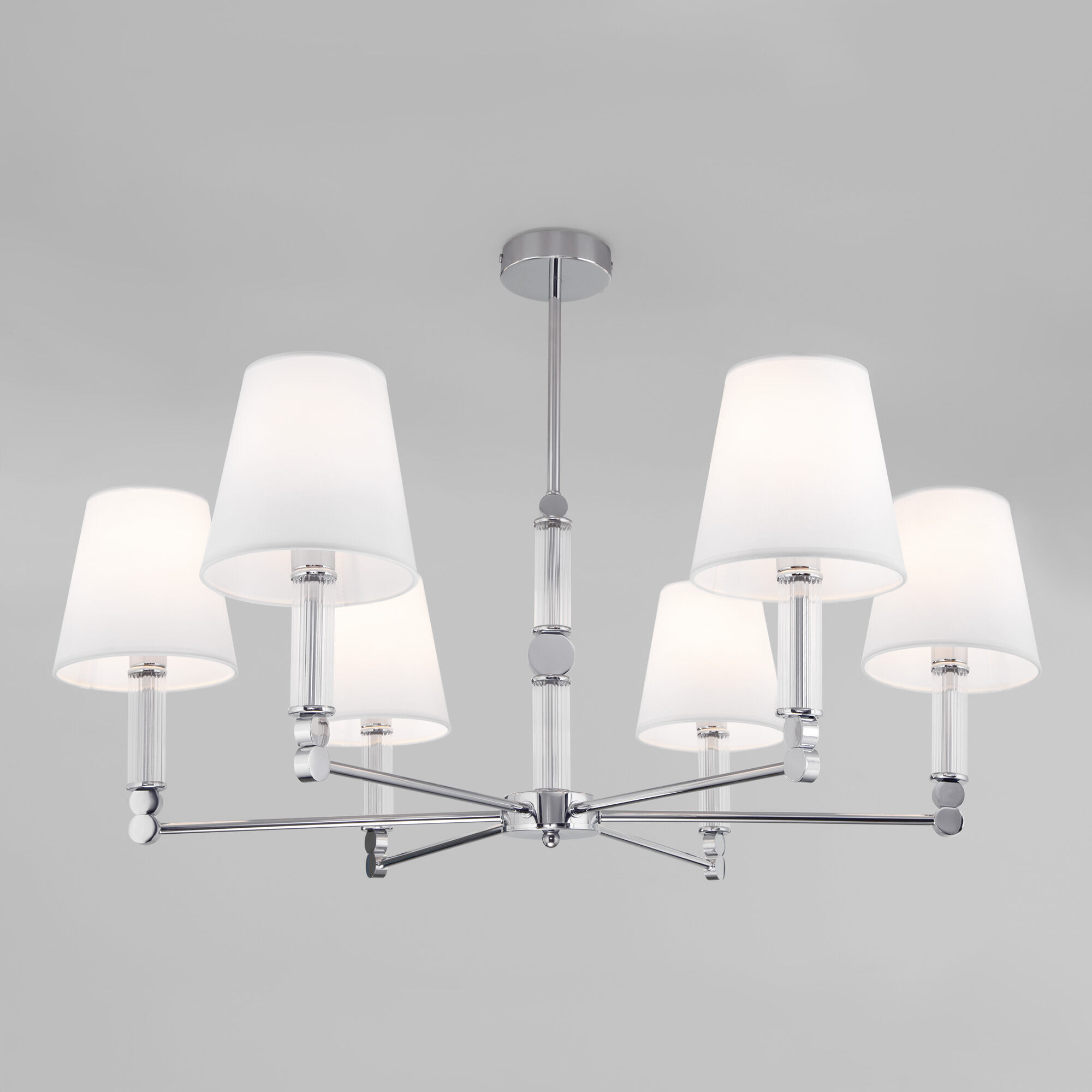 Элегантная люстра Conso соединяет в себе изысканный прованс и аристократичность. В дизайне потолочного светильника использованы восемь изящных тканевых абажуров, дающих мягкое рассеянное свечение, и утонченный декор арматуры цвета хром. Основания плафонов украшают вставки из прозрачного стекла. В модели используются сменные лампы с цоколем E27. Классический потолочный светильник Conso не только наполнит пространство светом, но добавит в интерьер умеренную торжественность.