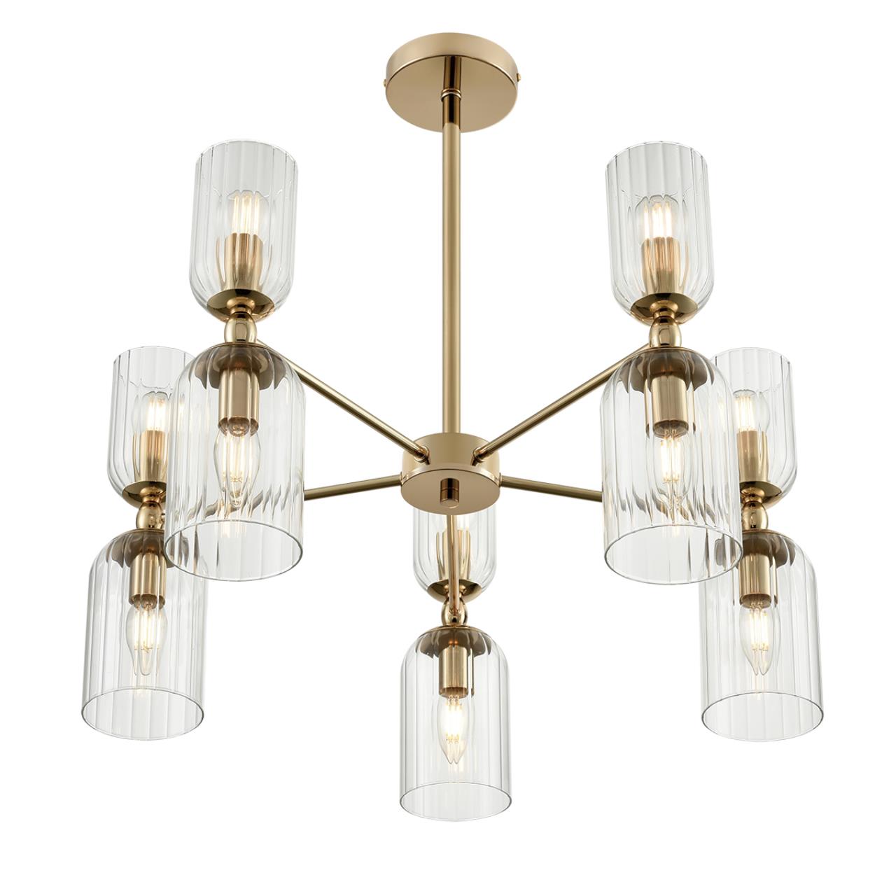 Линия светильников KASSIA станет оригинальным дополнением современных интерьеров. KASSIA сочетает металлический каркас в благородном золотом цвете и цилиндрические плафоны из прозрачного рифленого стекла. Плафоны меньшего размера направлены вверх, плафоны большего размера направлены вниз. Такое дублирование плафонов дает больше света и позволяет осветить большое пространство. В данной серии рекомендуется использование круглых небольших ламп в верхних плафонах и лампы в виде свечи – в нижних. Это добавит оригинальности и легкий ретро-акцент, который гармонично сочетается с современной стилистикой.Потолочные светильники KASSIA на 10 и 16 ламп станут центральным элементом в просторных залах, а утонченные бра дополнят уютную атмосферу вашего дома.