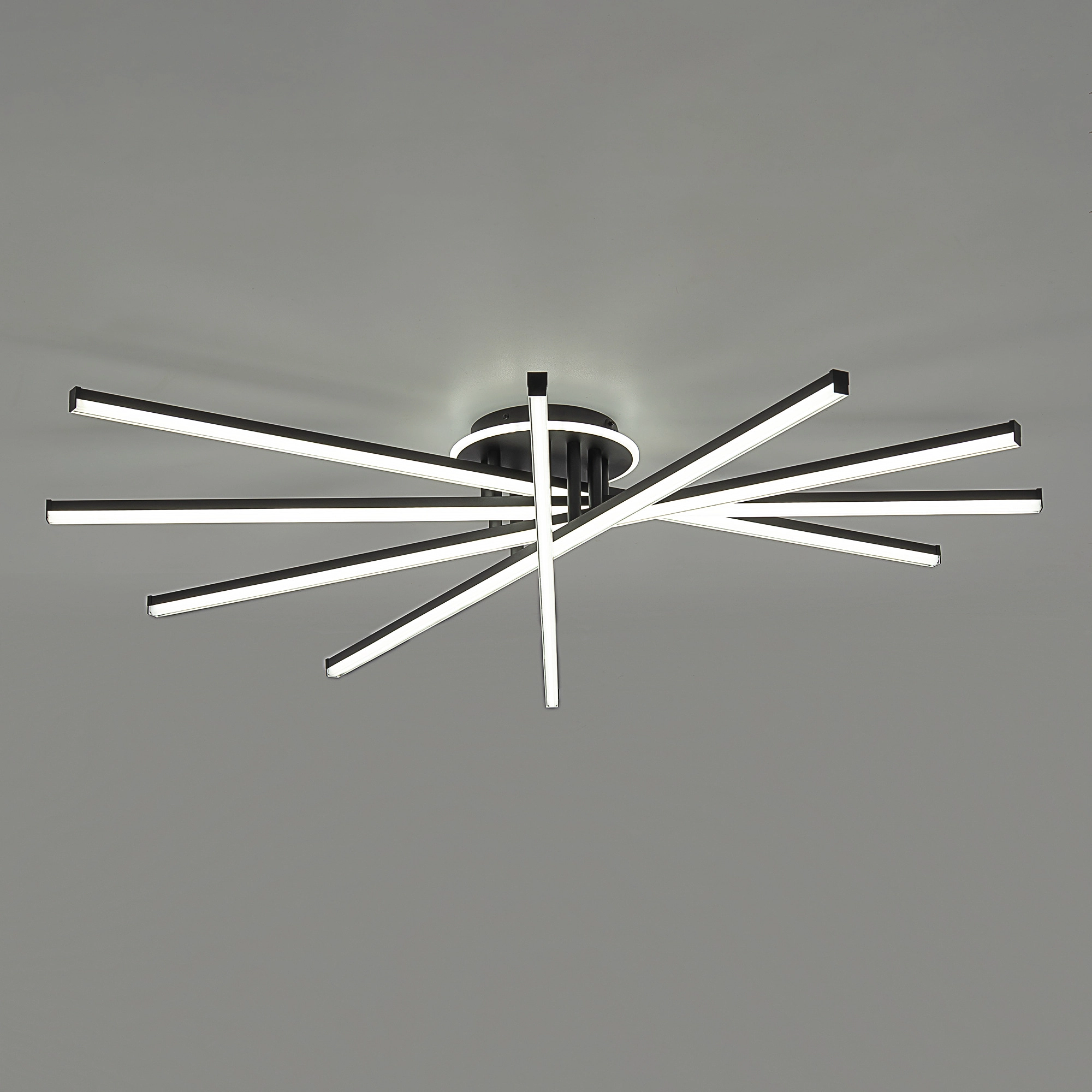 Корпус люстры — из металлического сплава, окрашенного черной краской. Глянцевый рассеиватель — из специализированного оптического полимера. У люстры есть изящная подсветка потолка.