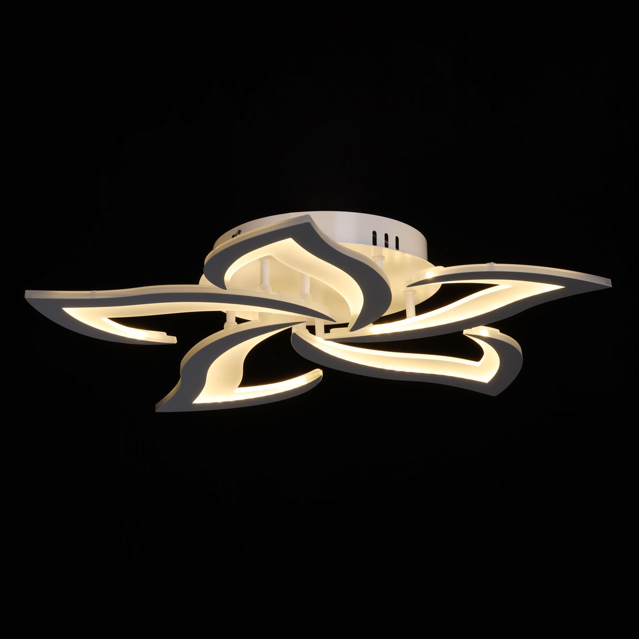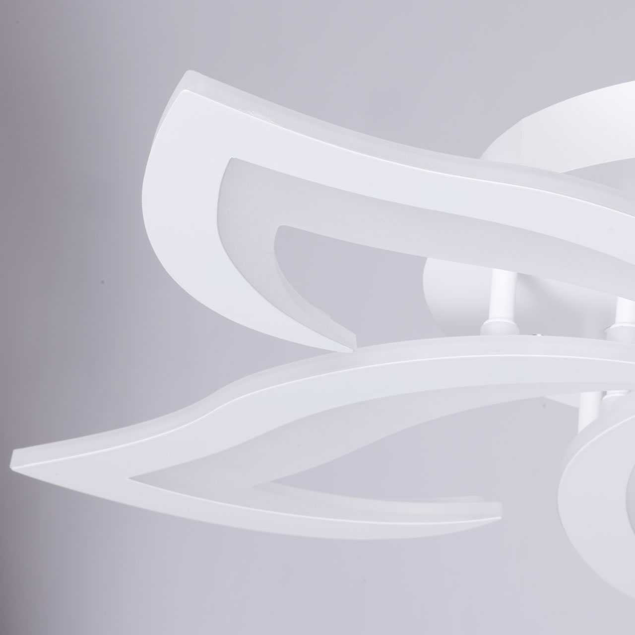 Металлическое основание потолочной люстры окрашено в белый цвет. Корпус плафона выполнен из сплава алюминия с цинком и окрашен в цвет основания. Светодиодный источник света закрыт матовым акрилом.