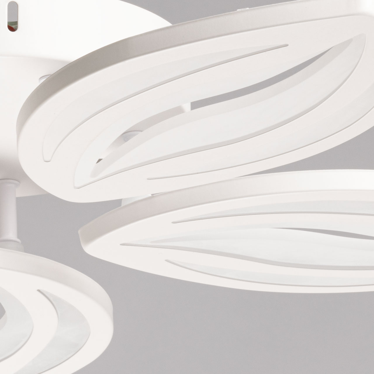 Металлическое основание потолочной люстры окрашено в белый цвет. Корпус плафона выполнен из сплава алюминия с цинком и окрашен в цвет основания. Светодиодный источник света закрыт матовым акрилом