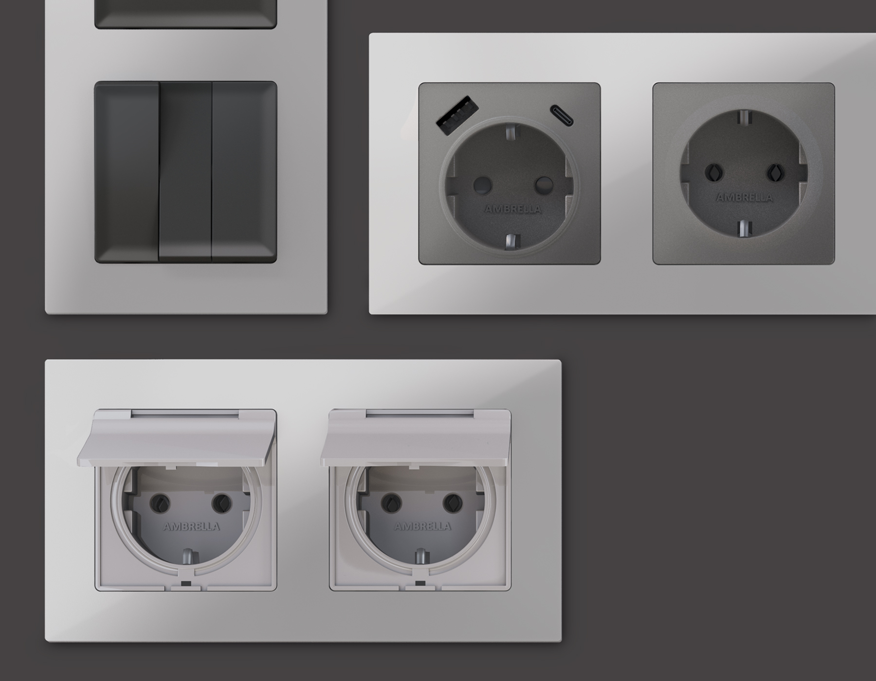 Многогранный ассортимент Ambrella Volt включает в себя механизмы, лицевые панели и рамки, а также комплекты, доступные в различных цветовых решениях. Продукция представлена в модульном исполнении, что позволяет гибко настраивать внешнийвид и функциональность. Вам будет легко заменить лицевую панель, рамку или механизм, найдя идеальное сочетание цветов.