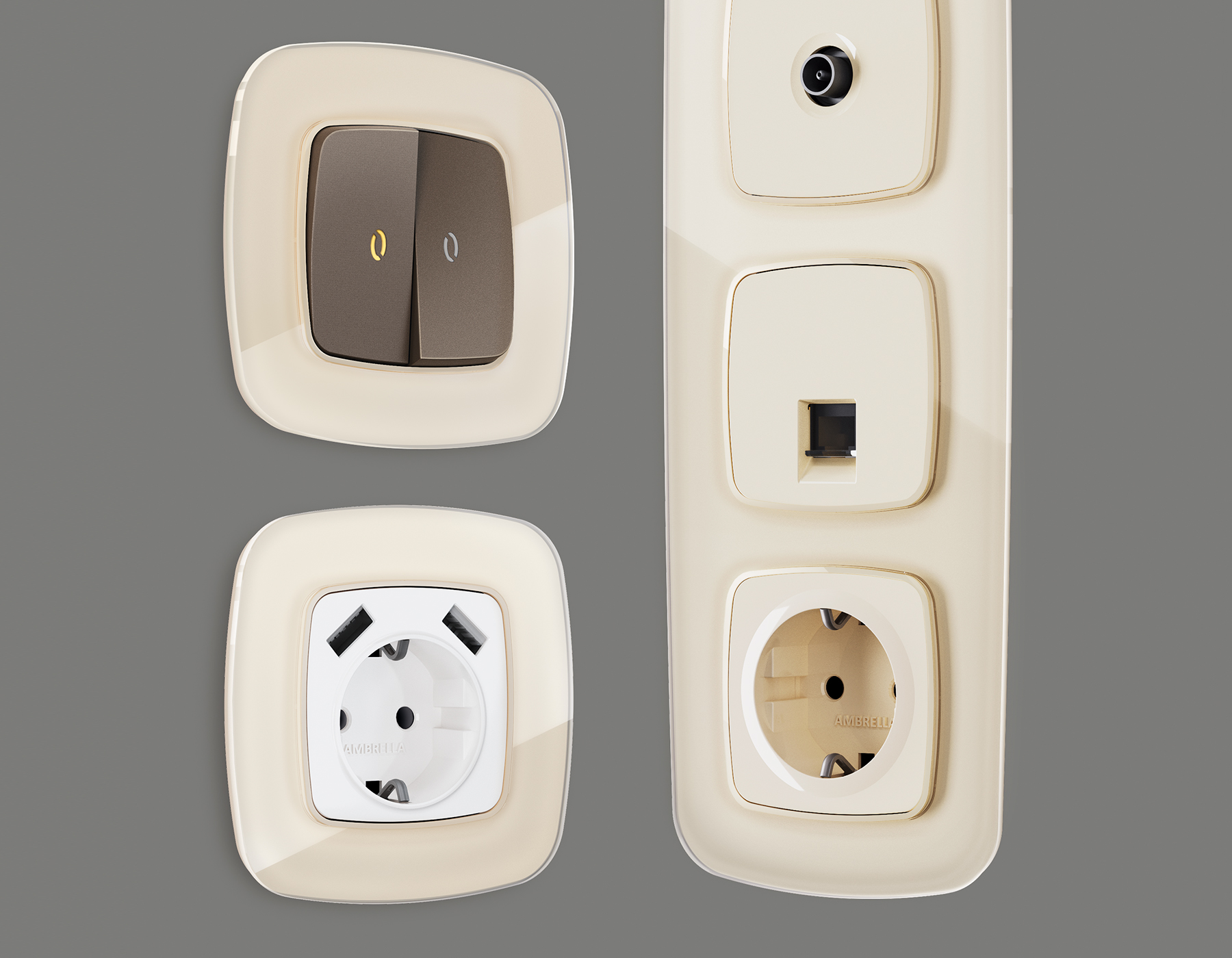 Многогранный ассортимент Ambrella Volt включает в себя механизмы, лицевые панели и рамки, а также комплекты, доступные в различных цветовых решениях. Продукция представлена в модульном исполнении, что позволяет гибко настраивать внешнийвид и функциональность. Вам будет легко заменить лицевую панель, рамку или механизм, найдя идеальное сочетание цветов.