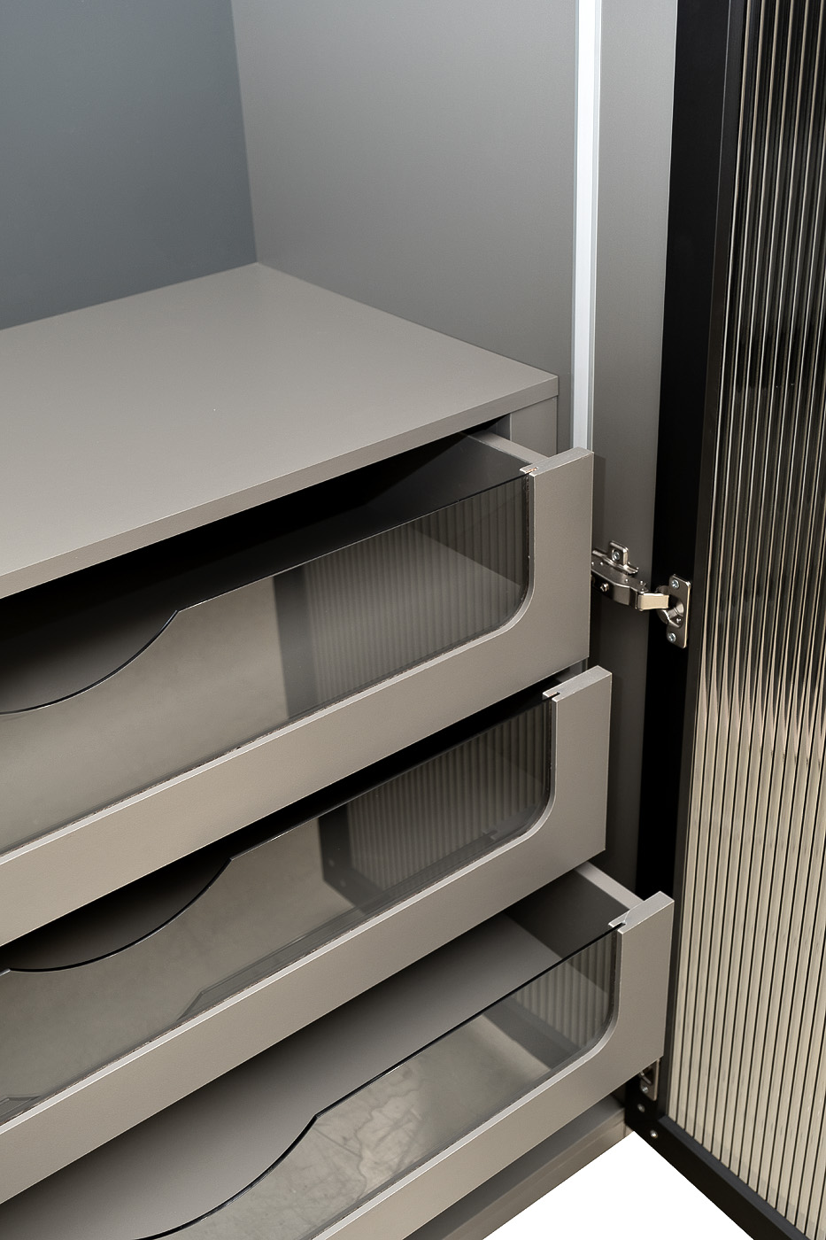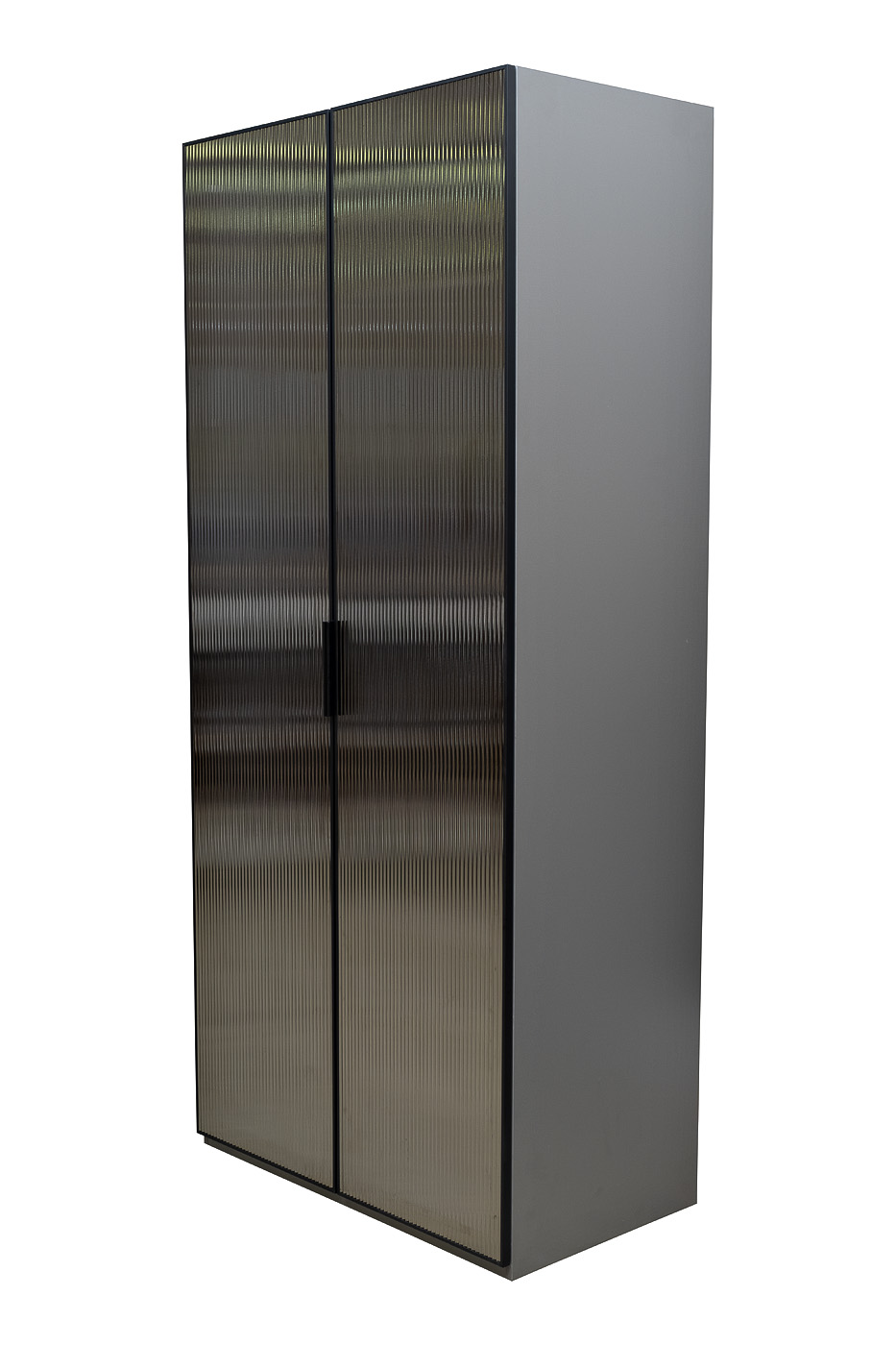 Изысканный двухдверный шкаф с выдвижными ящиками, декорированный рельефным тонированным стеклом, станет украшением гостиной или столовой, оформленной в стиле ар-деко. Игра света на рельефной поверхности стекла создает необычный оптический эффект и придает этому предмету мебели особый шарм. Темный оттенок тонированного стекла приглушает блеск и создает ощущение таинственности. В шкафу предусмотрены выдвижные ящики для белья и штанга для одежды. Складская программа. Шкаф двухдверный c выдвижными ящиками, дверца- стекло рифленое (ЛДСП серый Кобальт 6299BS, тм Kronospan)