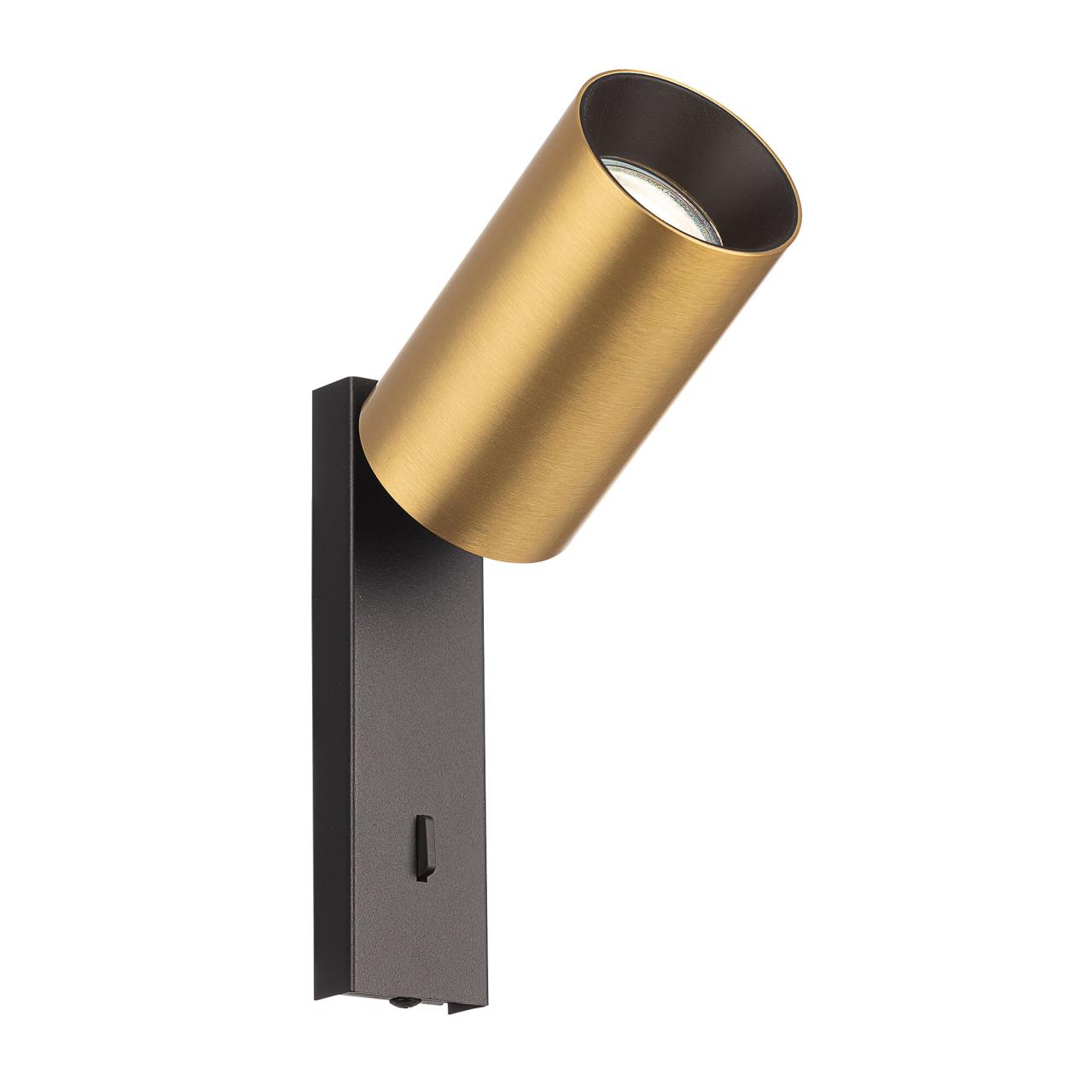 Корпус модели металлический, стильного латунного оттенка. Плафон цилиндрической формы имеет поворотное крепление, позволяющее менять направление светового луча. Источником света служит светодиодная лампочка с цоколем GU10 мощностью не более 10Вт. Тип крепления — планка, выключатель расположен на корпусе.