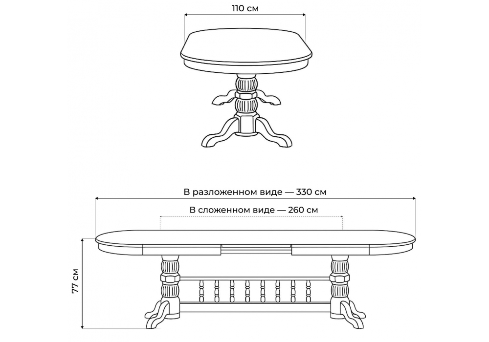 Материал каркаса - массив бука; Материал столешницы - Шпон; Ширина - 110; Высота - 77; Длина стола в разложенном виде - 330; Длина - 260;