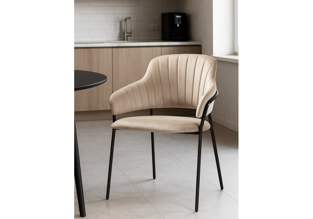 Высота подлокотников: 65 см. Материал каркаса - металл; Материал сиденья - велюр; Материал обивки - велюр; Ширина - 57; Глубина - 56; Высота - 82; Ширина сиденья - 48; Глубина сиденья - 47; Высота сиденья - 49;