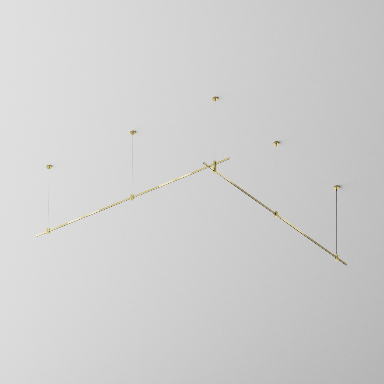 Подвесная конструкция системыFlarityугловойформыстросовымиподвесами . Светильники и блоки питания приобретаются отдельно, в зависимости от требуемого проекта.