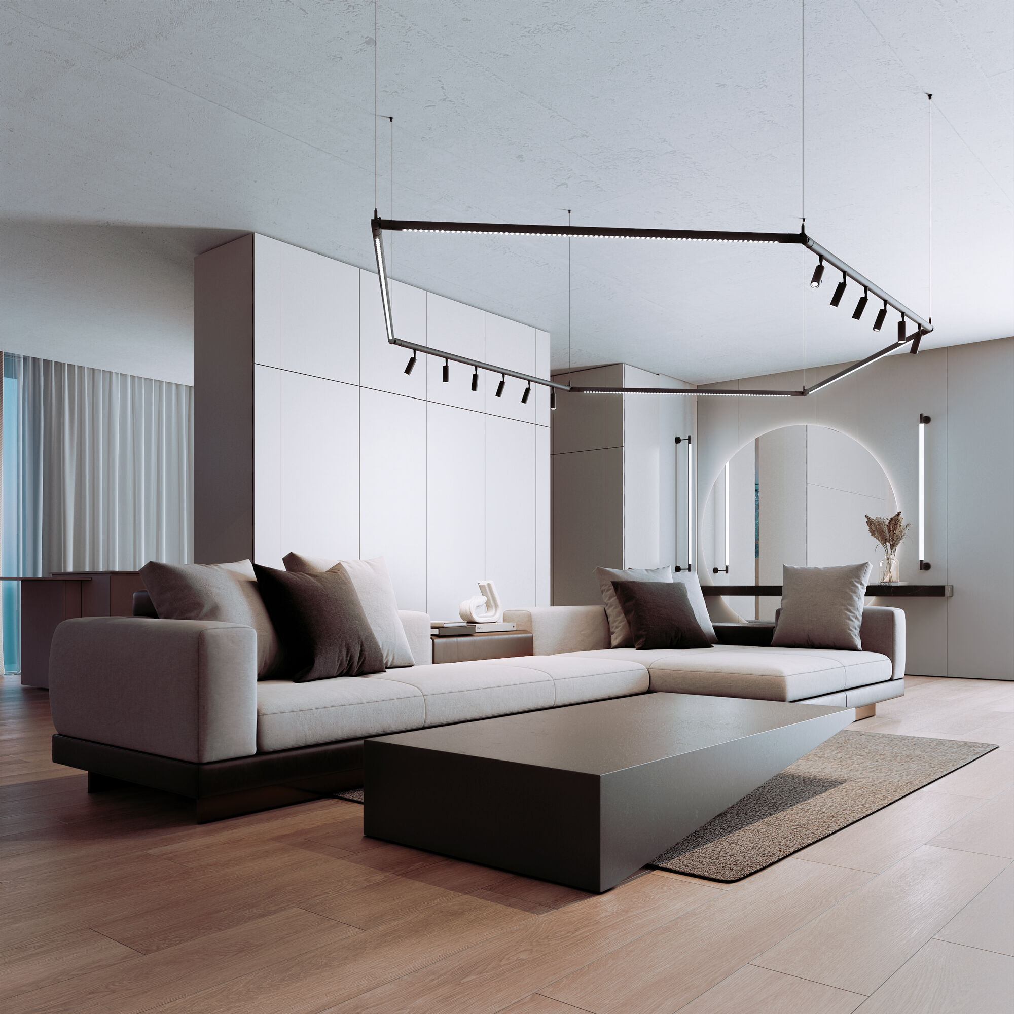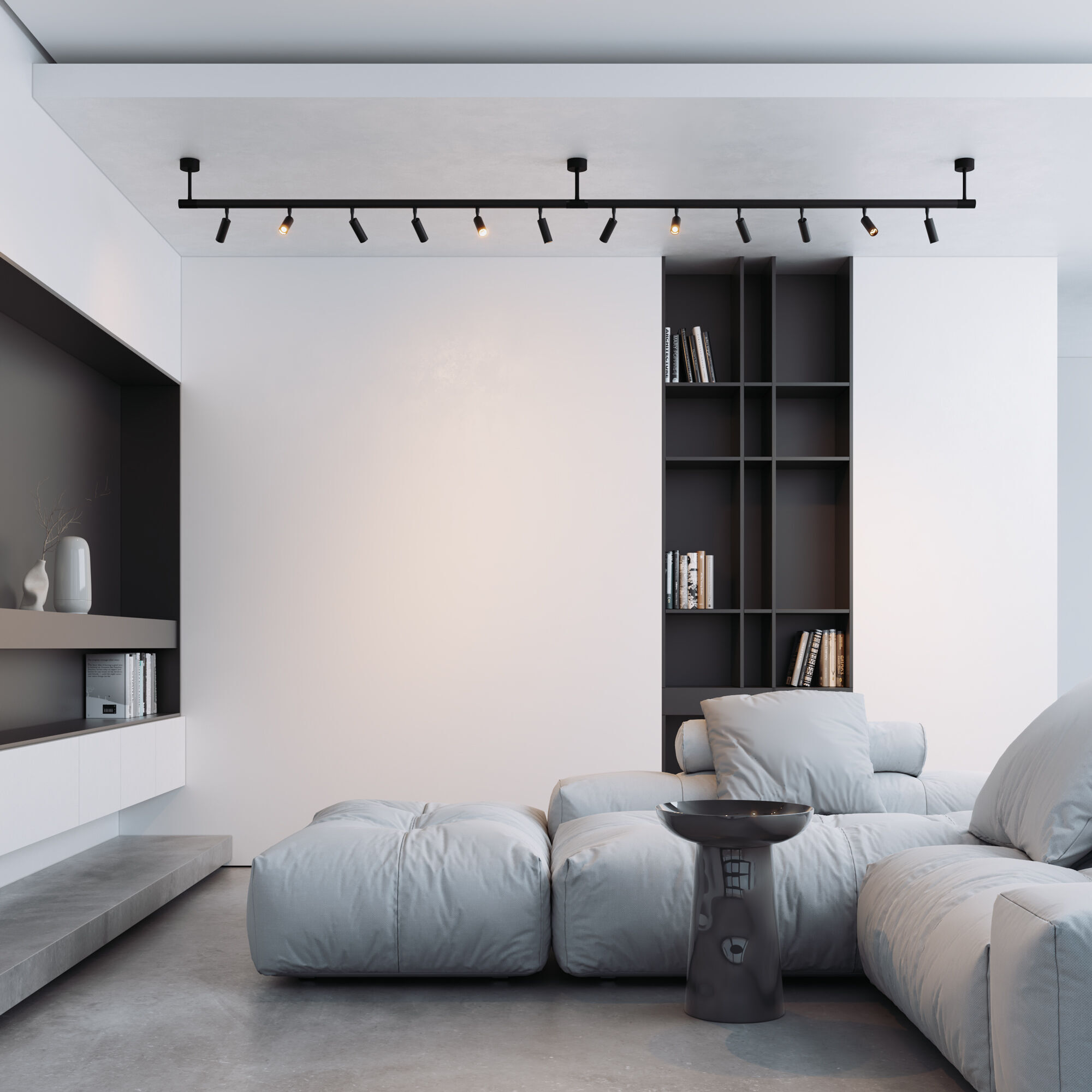 Трековые Светильники представлены в трех видах и двух размерах: длина 885 мм с мощностью 18 Вт и длина 1285 мм с мощностью 24 Вт, что дает возможность не только комбинировать различные виды светильников, но и варьировать их размеры, создавая уникальные световые решения.