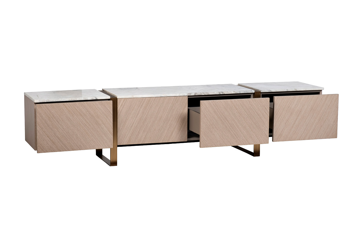 Длинная тумба под телевизор – универсальное решение для современной гостиной или спальни. Данная мебель позволяет организовать функциональную ТВ-зону и удобное хранение домашних вещей. Мраморная столешница тумбы прекрасно справляется с функцией подставки под телевизор и декор. Благодаря светлому оттенку шпона стильная тумба под ТВ прекрасно комбинируется с современной мебелью.