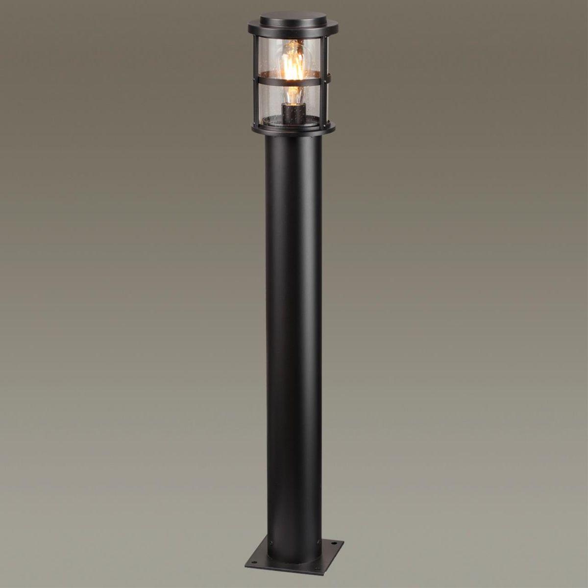 Черный уличный светильник с плафоном из прозрачного стекла в виде фонаря, расположенного на круглом столбе.