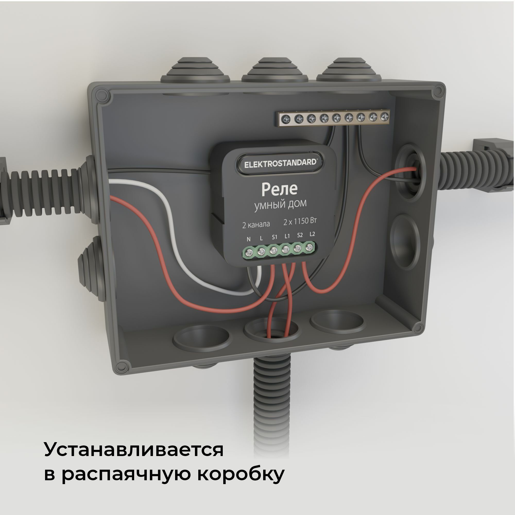 Установка реле производится в помещении. Компактный размер реле позволяет размещать его в распаячной коробке, стандартном подрозетнике или совместно с выключателем или розеткой в углубленном подрозетнике.