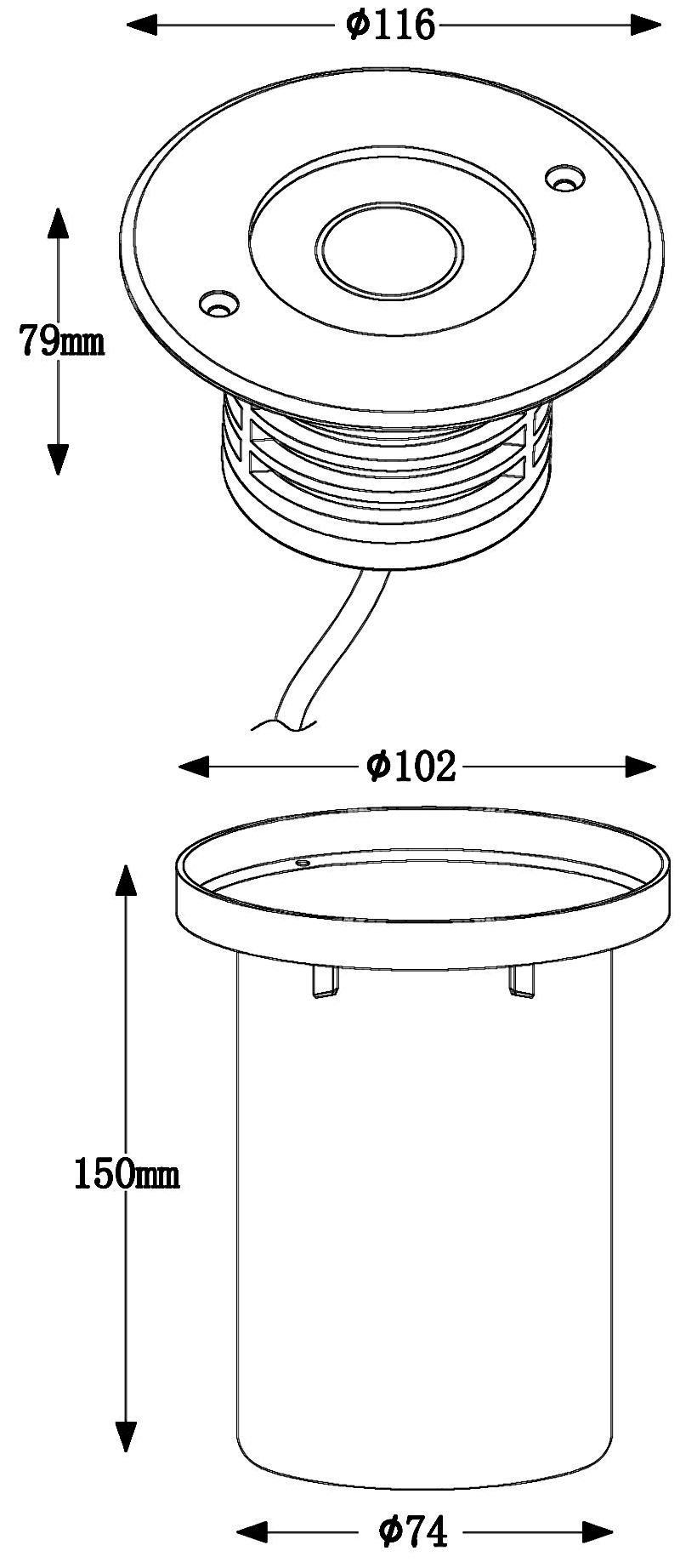 - Диаметр врезного отверстия: 74 мм (7.4 см)