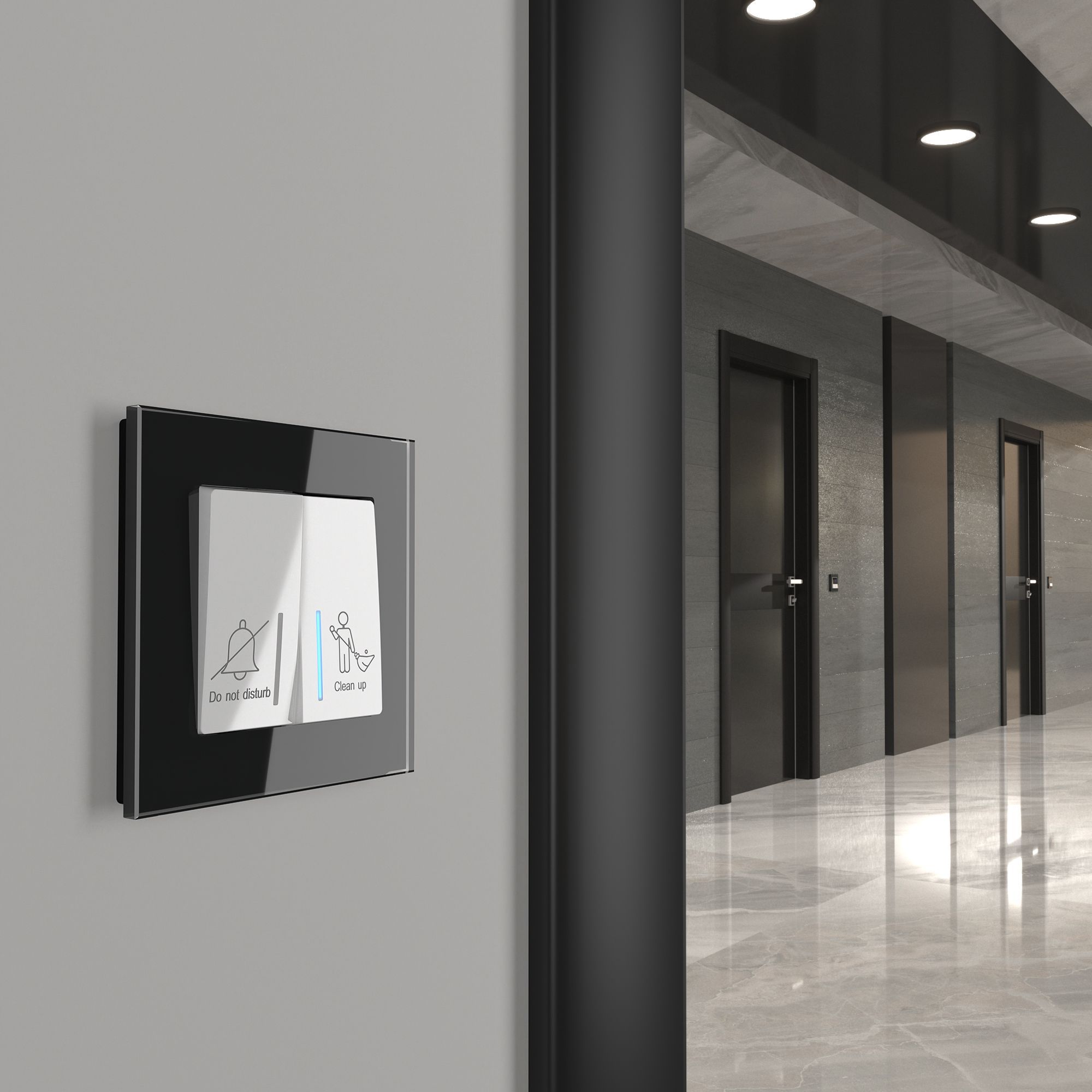 Кнопка вызова горничной передаёт сигнал персоналу на дверной звонок с индикатором, находящийся снаружи номера. Включение гостем режима «не беспокоить» также отображается на индикаторе — и отключает дверной звонок. Кроме того, механизм может использоваться в офисах и медицинских учреждениях.